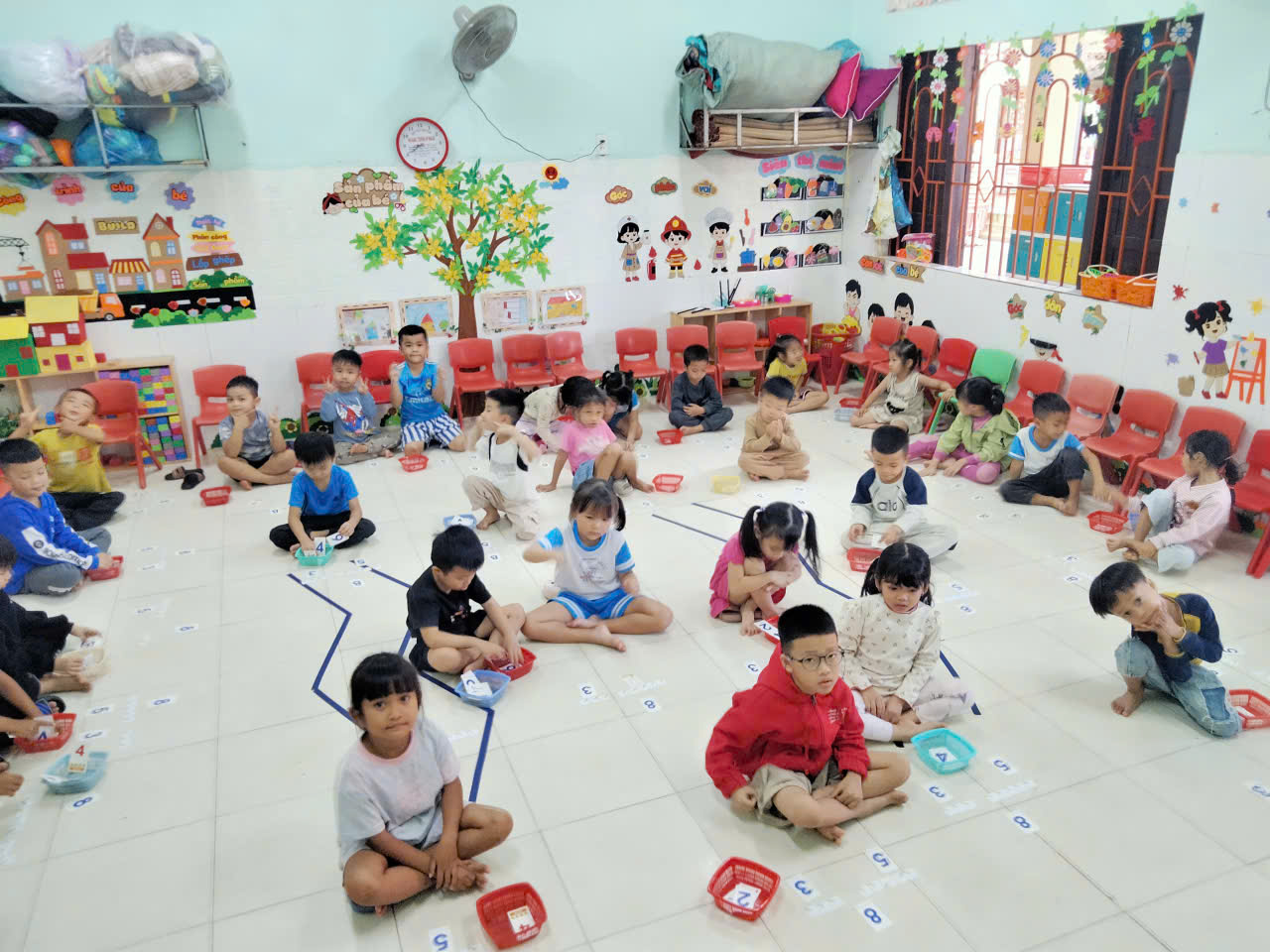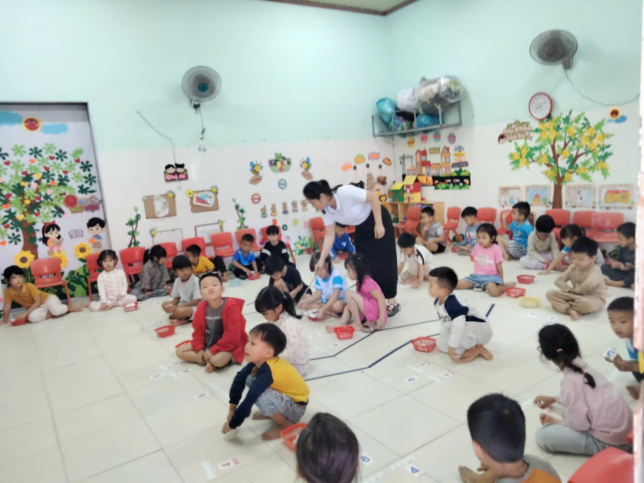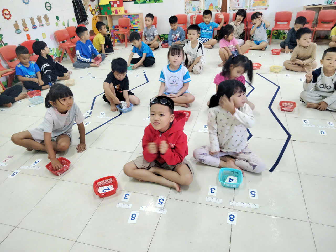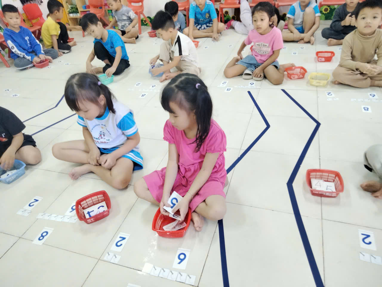 Trong giờ học, trẻ được sử dụng thẻ số, rổ đựng và các đồ vật trực quan để thực hành tách một nhóm 8 đối tượng thành các phần khác nhau (ví dụ: 5 và 3, 6 và 2…), sau đó gộp lại để nhận biết tổng vẫn là 8. Các trò chơi như “chia nhanh – gộp đúng”, “ai khéo tay hơn” giúp trẻ hứng thú, tích cực tham gia và ghi nhớ kiến thức một cách tự nhiên.