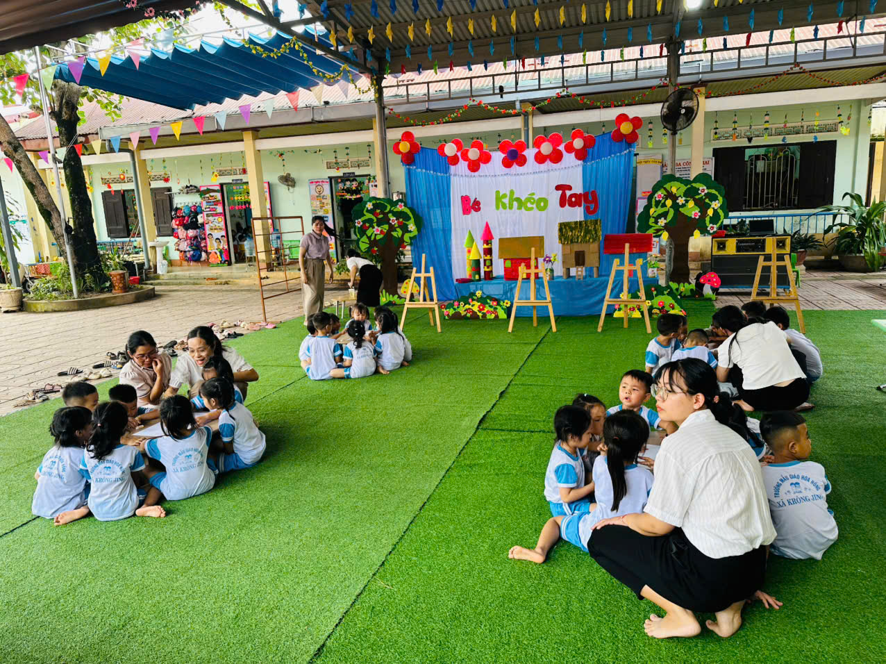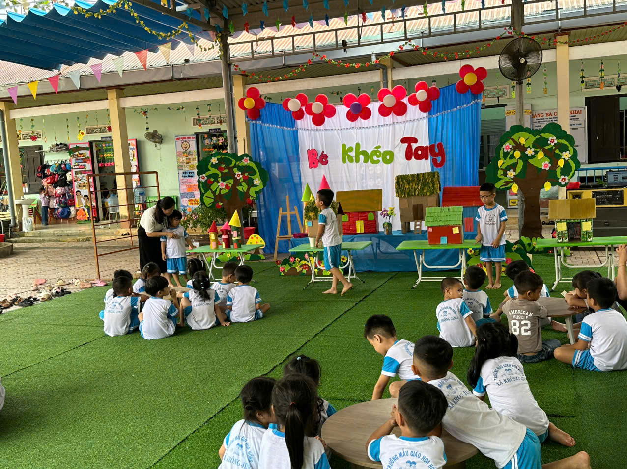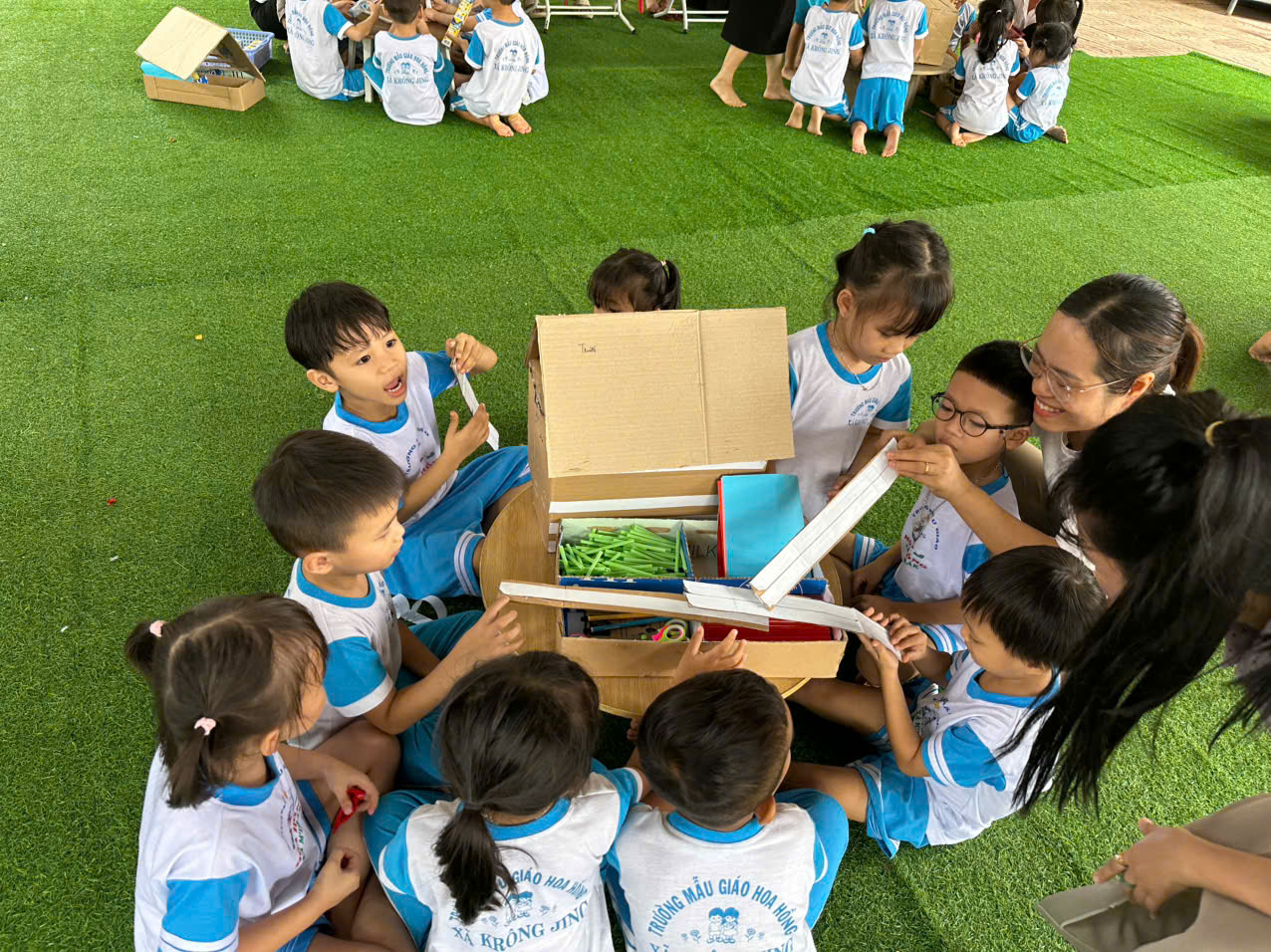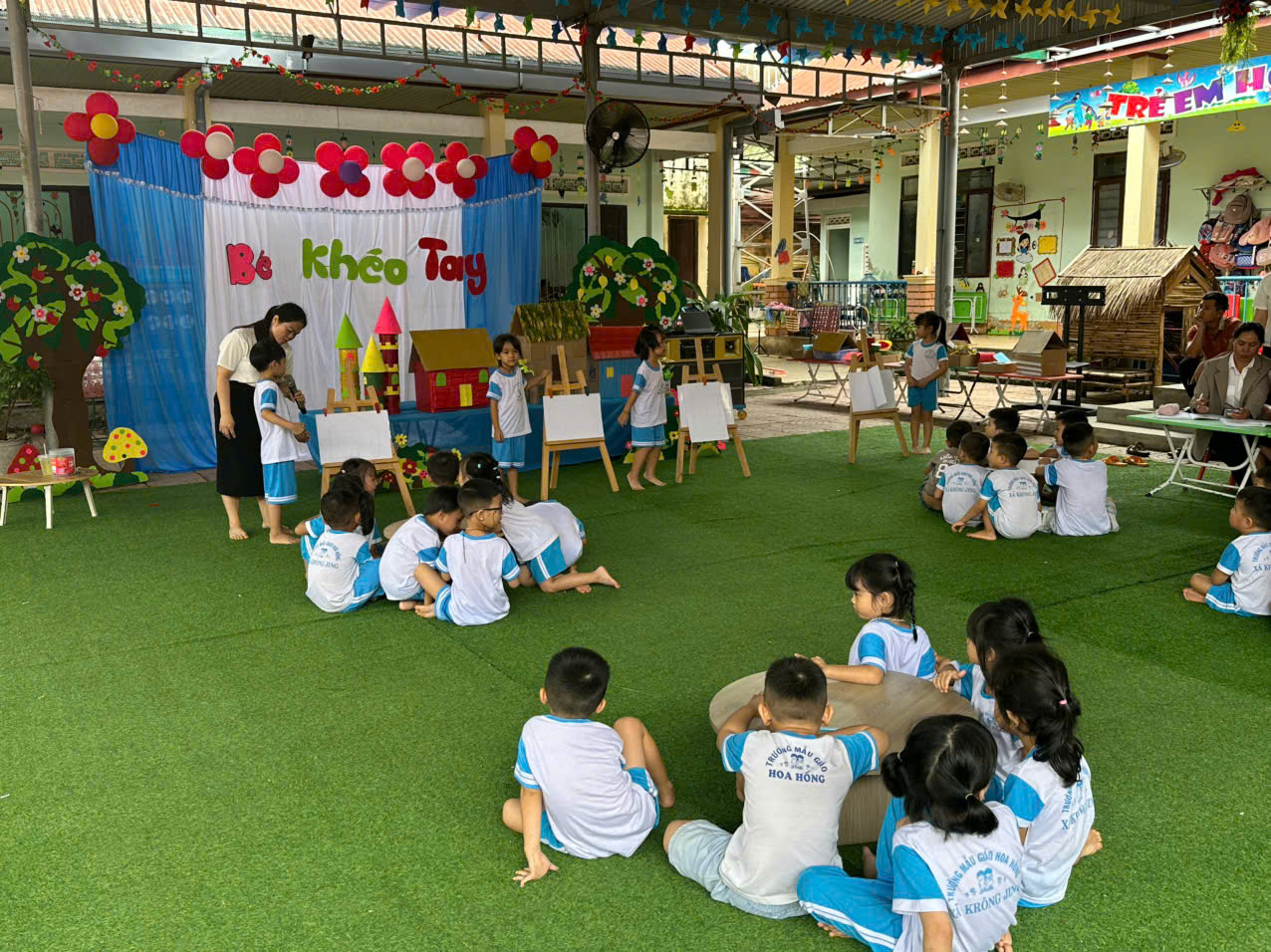 - Tiết hoạt động PTTM: “Tạo hình ngôi nhà” của cô Phạm Thị Thúy lớp lá , giúp trẻ quan sát, nhận xét, thảo luận, lắng nghe, trao đổi ý kiến, biết lựa chọn nguyên vật liệu phù hợp để thiết kế ngôi nhà. Thể hiện được ý kiến cá nhân bằng lời nói về sản phẩm của nhóm mình tạo ra.